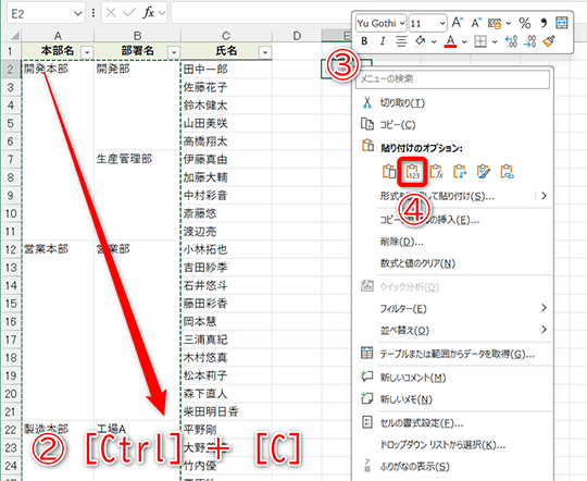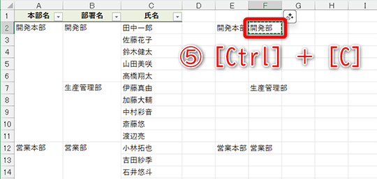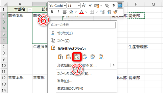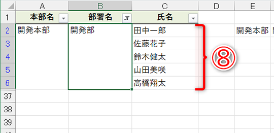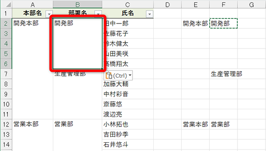 試しに結合セルを分割してみると、すべてのセルに「開発部」と入力されていることがわかります。なお、元に戻すときは[Ctrl]+[Z]キーを押してください。先頭以外の値が破棄されるメッセージが表示されますが、問題なく[数式]貼り付けした状態に戻せます。