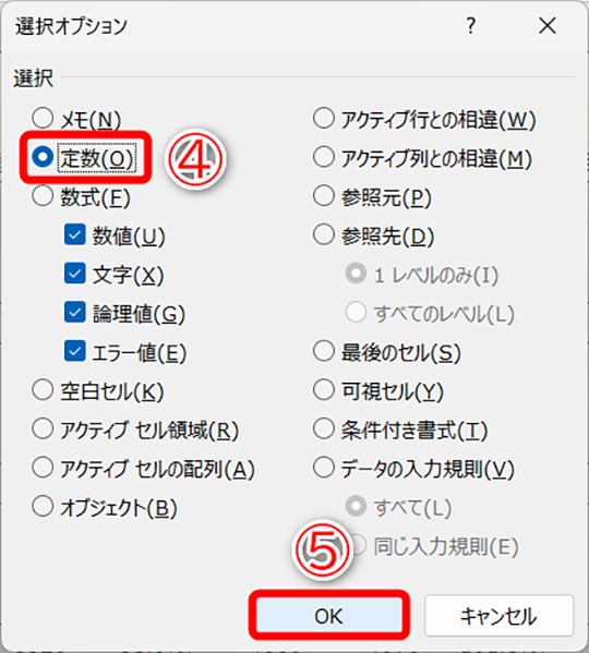 [ジャンプ]の機能を使えば、数式のセルを選択することは可能です。しかし、“数式以外”を選びたいときはひと手間かかります。単に[定数]を選択すると、見出しや説明の文字列まで含まれてしまうため、数値と数式が入力されたセル範囲を選択する必要があります。