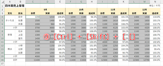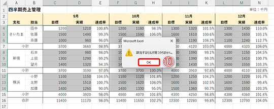 [Ctrl]+[Shift]+[[]キーを押すたびに、参照元のセル範囲が切り替わり、『該当するセルが見つかりません。』というメッセージが表示された時点で、固定値(数値)のセルのみが選択された状態になります。