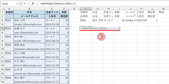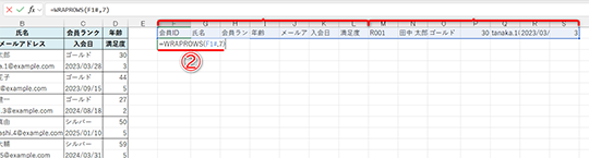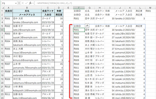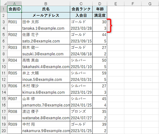 1レコード分の情報が“複数行で1セット”になっている表がありますよね。例えば、人事データや会員リスト、イベント参加者の名簿など、現場では意外とよく見かけるパターンです。以下の表は[会員ID][氏名][会員ランク][年齢]と[メールアドレス][入会日][満足度]の2行で1レコードが構成されています。