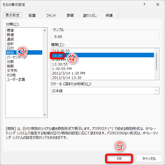 まずは、9:00~18:00など、一定間隔で並べた「時間の一覧」を用意して、タイムテーブルの軸とします。A列とB列に入力するのは、本日の作業内容です。ここで注意したいのは、A列とD列に入力する“時刻”です。「9:00」などと直接入力して構いませんが、念のために表示形式を[時刻]に揃えておきます。