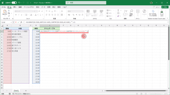 結果をスピルで表示させるため、1つめの引数[検索値]には「D2:D20」と指定しています。「SORT(A2:A20)」と「SORTBY(B2:B20,A2:A20)」は、予定の時刻を昇順で並べ替えるための仕掛けです。5つめの引数[一致モード]には「1」と指定します。これは「完全一致または次に大きい項目」を意味しています。