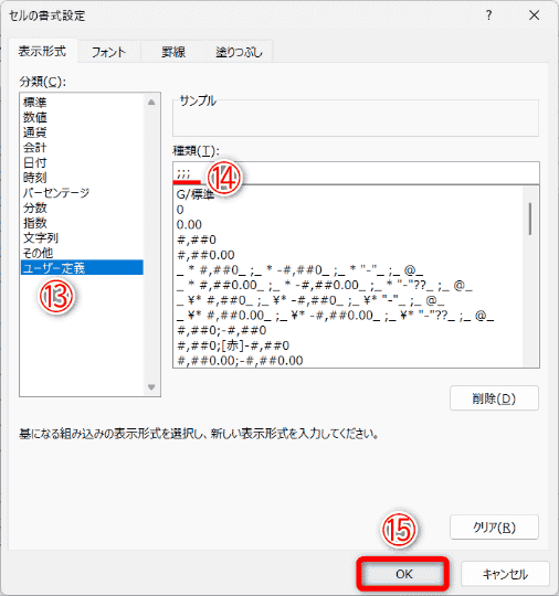 連続して表示されている同じ予定をまとめておきましょう。条件付き書式を利用して、前の行と同じなら、今の行を非表示にします。「ユーザー定義」の書式欄に「;;;」と入力します。