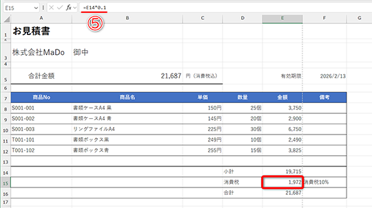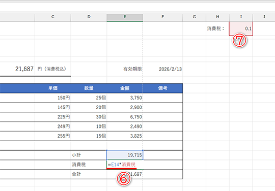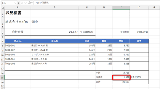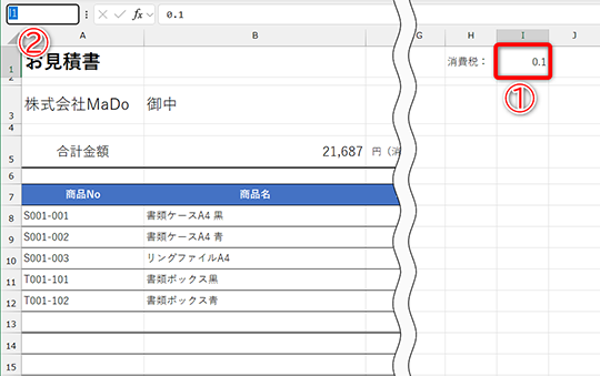 数値を入力したセルに名前を付けておくと、表のメンテナンスに役立ちます。例えば、消費税率を入力したセルに「消費税」と名前を付けておくことで、数式中で名前を利用することができます。単純なセル参照で済むケースもありますが、名前を使えば修正箇所が1か所に集約され、計算の意図も明確になります。プログラムの変数のように扱うとイメージしやすいでしょう。