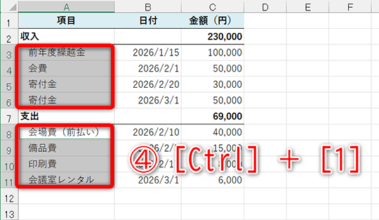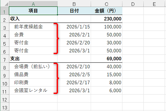 例えば、収支報告書の「収入」と「支出」の大項目に「会費」「寄付金」「会場費」「印刷費」といった項目がぶら下がっているイメージです。