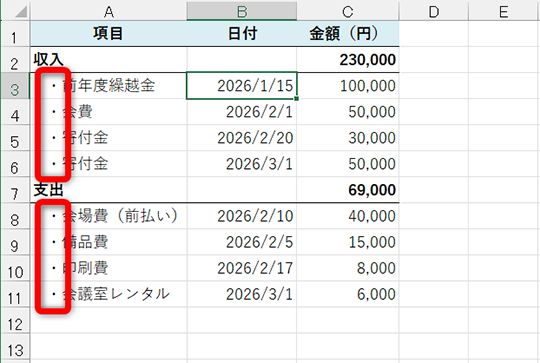 このような表を作成する際、文字列の先頭に空白を入力して、字下げしてしまう人は少なくありません。空白ではなくて、「・」のような記号を挿入したいケースもあります。見た目はそれらしく整いますし、印刷が目的なら問題にならないかもしれません。