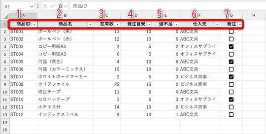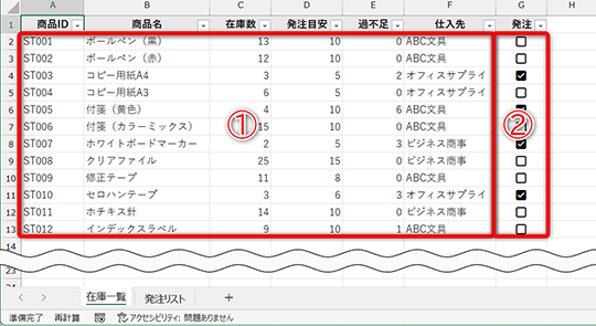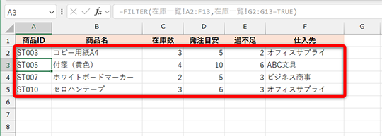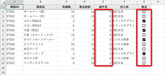 なお、「過不足」列には「=MAX(D2-C2,0)」といった数式が入力されています。発注目安から在庫数を引いて、十分な在庫数がある場合は「0」となるようにしています。マイナス表現を避ける定番の数式です。