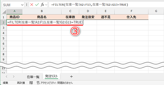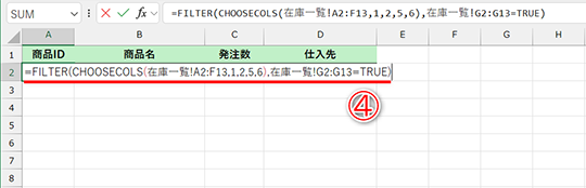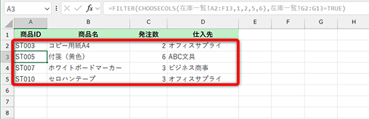 FILTER関数を利用してチェックを付けた行のみを取り出せましたが、発注表としては「在庫数」や「発注目安」の列は不要ですよね。抽出先の表見出しを「商品ID」「商品名」「発注数」「仕入先」として、必要な情報だけに絞り込めるようにします。
