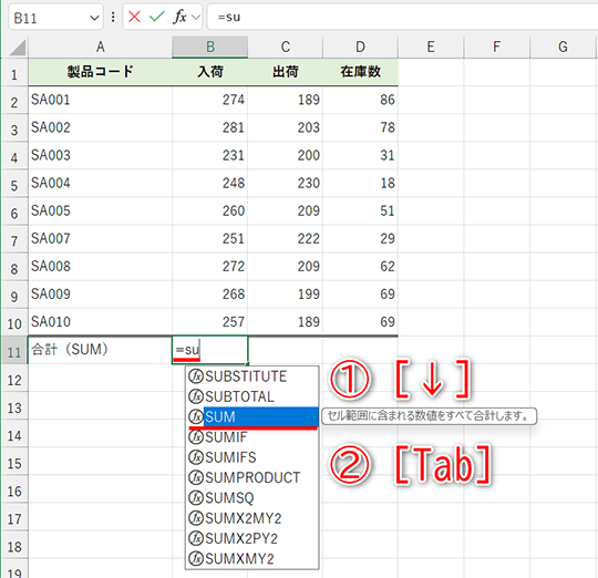 「=」に続けて関数を入力しますが、すべてを手入力する必要はありません。例えば、「=su」と入力すると、入力候補として「SU」から始まる関数名が一覧表示されます。[↓]キーで目的の関数を選択し、[Tab]キーを押すと「=関数名(」と自動入力されます。あとは引数となるセル範囲を選択して、[Enter]キーを押すだけです。数式の終わりを表す「)」は自動的に補完されます。