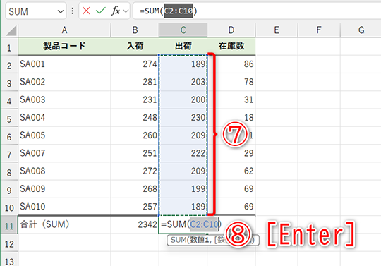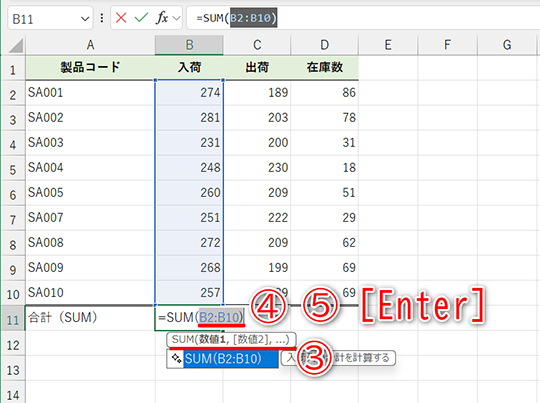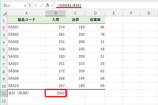 - セルB11の数式(SUM関数):=SUM(B2:B10)