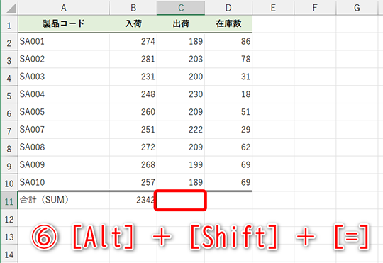 合計を求めるSUM関数は、ショートカットキーでも入力可能です。[Alt]+[Shift]+[=]キーを押すと、自動的にSUM関数が挿入されます。ただし、自動的に判断された合計範囲が意図通りとは限らないため、必ず確認してください。