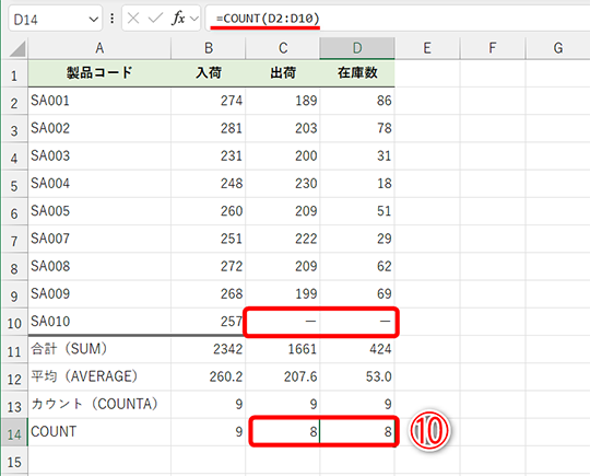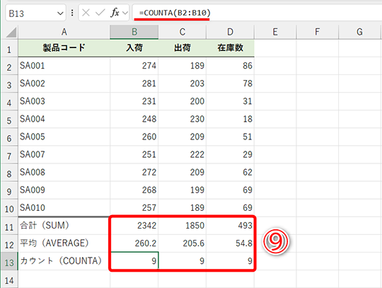 - セルB13の数式(COUNTA関数):=COUNTA(B2:B10)