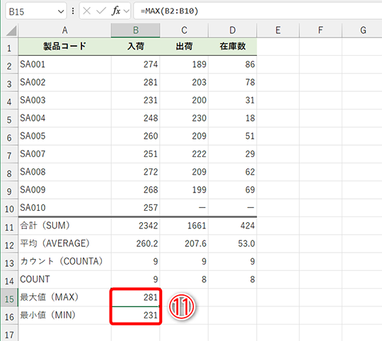 - セルB15の数式(MAX関数):=MAX(B2:B10)