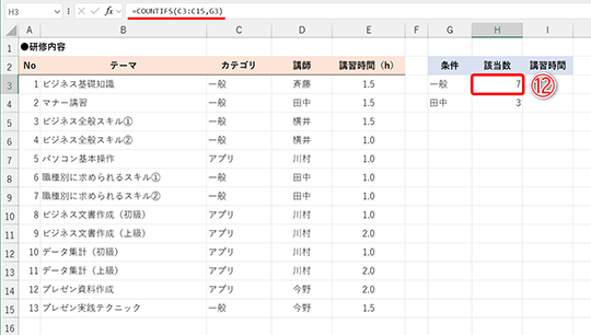 - セルH4の数式:=COUNTIFS(C3:C15,G3,D3:D15,G4)