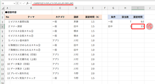 - セルH4の数式:=SUMIFS(E3:E15,C3:C15,G3,D3:D15,G4)