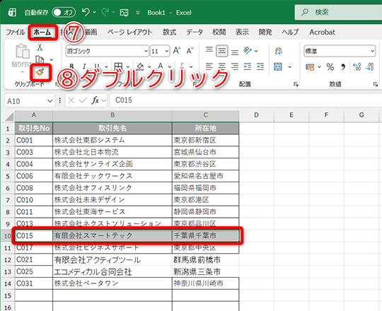 「最後にまとめて書式を設定する」と決めておけば、都度調整する必要はありませんが、貼り付けたデータの書式の違いが気になる場合は[書式のコピー/貼り付け]を利用します。書式をコピーするセルを選択して、[ホーム]タブにある[書式のコピー/貼り付け]ボタンをダブルクリックすれば、連続して“書式のみ”を貼り付けられます。書式のコピーが終わったら、[ESC]キーを押して解除しておきましょう。