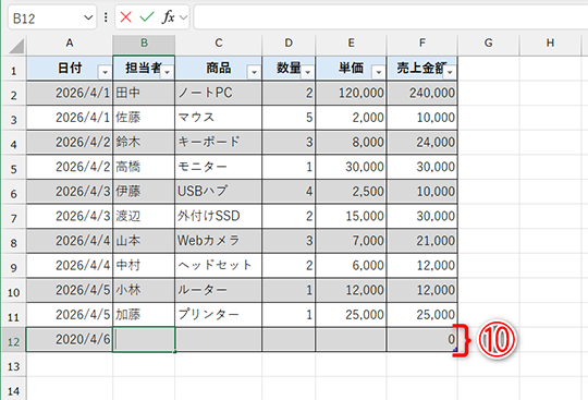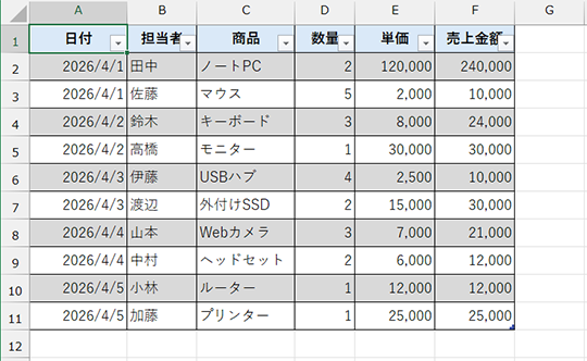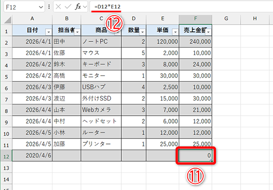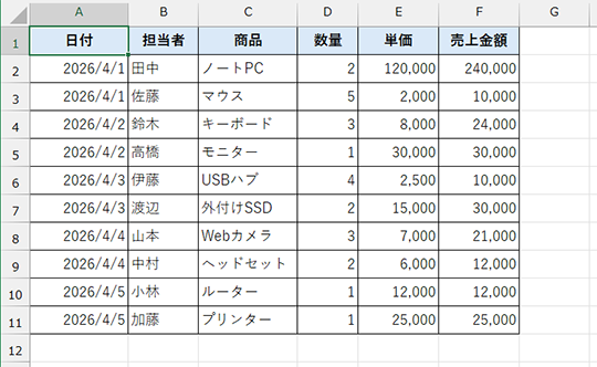 ここでは、「売上金額」列に「数量」列と「単価」列を掛け合わせる数式が入力されており、同様の数式が新しい行にも反映されていることがわかります。