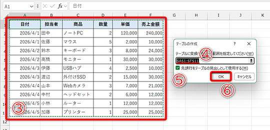 意図するセル範囲が認識されない場合は、[テーブルの作成]ダイアログボックスが表示された状態でドラッグし直してください。