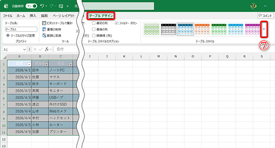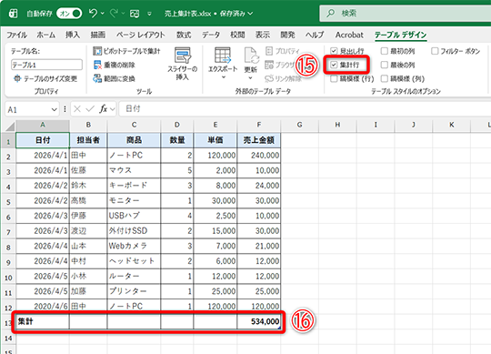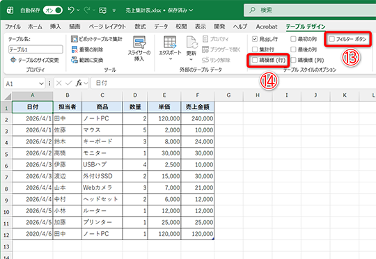 テーブルに変換後、自動的に表示されたフィルターボタンは[テーブル デザイン]タブから表示/非表示を切り替えられます。また、集計行や「しましま」の背景色の設定も可能です。