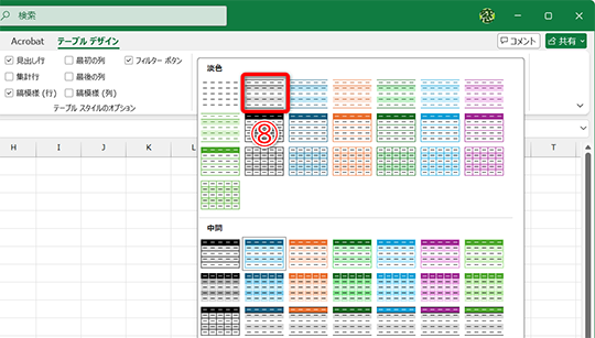なお、あらかじめ用意されたデザインが適用されますが、元の表に設定されている書式も重なります。いったん[なし]に設定して、好みのデザインに変更してもいいでしょう。