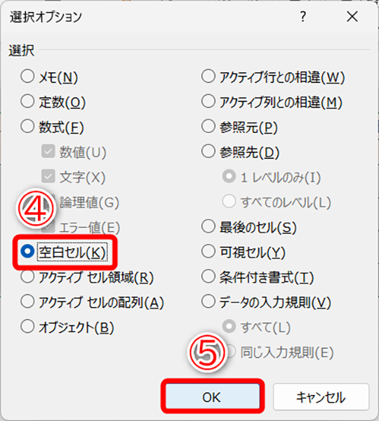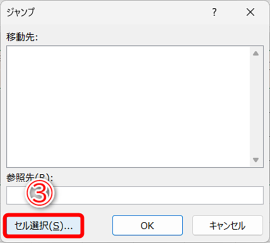 空白セルに対する処理が目的ではなく、入力漏れをチェックする観点でも便利な機能です。[Ctrl]+[G]キーを押して[ジャンプ]ダイアログボックスを表示して、[セル選択]をクリックします。
