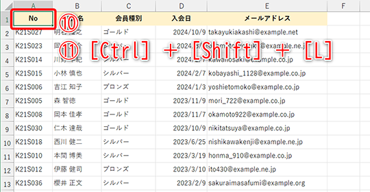 データの並べ替えや絞り込みは基本操作ですが、毎回[データ]タブを切り替えて[フィルター]ボタンをクリックする必要はありません。[Ctrl]+[Shift]+[L]キーを押すだけで、フィルターボタンのON/OFFを切り替えることができます。