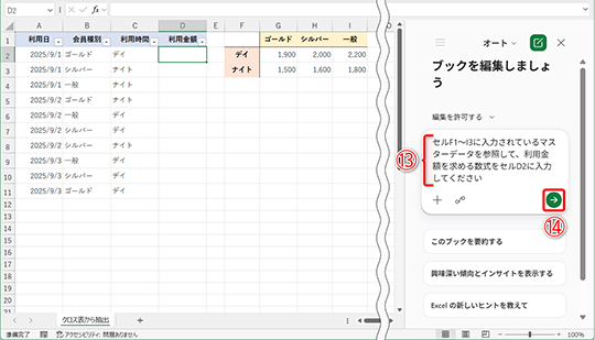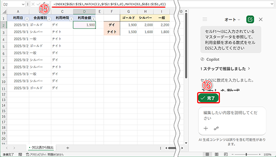 ExcelのCopilotにプロンプト(指示)を言葉で入力するだけで、行列の挿入や書式の設定、数式の入力などの操作が可能です。例えば、以下のようなプロンプトを入力するだけで、マスターデータを参照するような複雑な数式も簡単に入力できてしまいます。