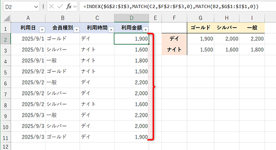 セルF1~I3に入力されているマスターデータを参照して、利用金額を求める数式をセルD2に入力してください