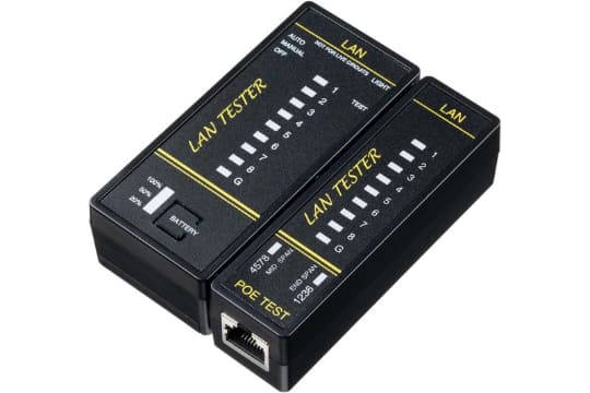 LANケーブルテスターは、LANケーブルの結線状態を確認するためのチェッカー。LANケーブルの両端(RJ-45コネクタ)を、テスターの親機と子機に接続することで、ケーブルの導通・断線・結線ミスやグランドの有無を確認することができます。手持ちのLANケーブルに異常がないかチェックするのに便利です。また電話回線ケーブル(RJ-11コネクタ)もチェックできます。今回セールとなっているのは以下の2製品。