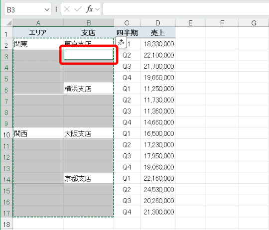 なお、空白セルを選択した後アクティブなセルが値の入力されたセルに隣接していないと、意図通りにデータを入力できないことがあります。その場合は、値の入力されているセルに隣接するように、[Tab]キーでアクティブなセルを切り替えてください。