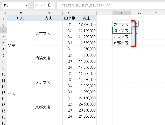 FILTER関数を使うのが簡単です。具体的には以下のように入力します。引数[配列]には、値を取り出したい結合セルを含むセル範囲を指定します。2番目の引数[含む]には、[配列]と同じセル範囲を指定したうえで「<>""」と指定します。「空白でない」という条件になります。