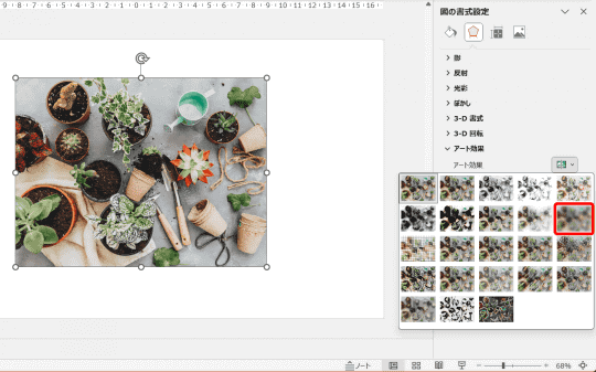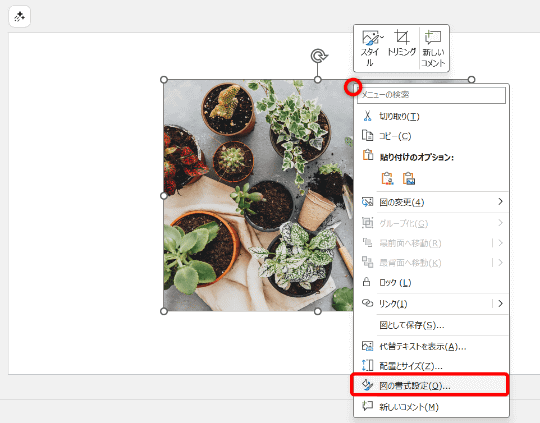 まずは任意の画像を用意して“書式設定”のウィンドウを表示します。ここでは、PowerPointに用意されている[ストック画像]を使いました。必要な画像は1枚だけです。