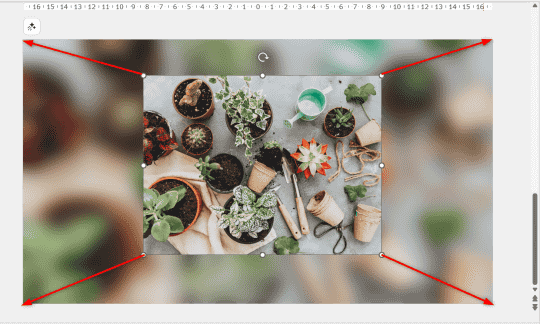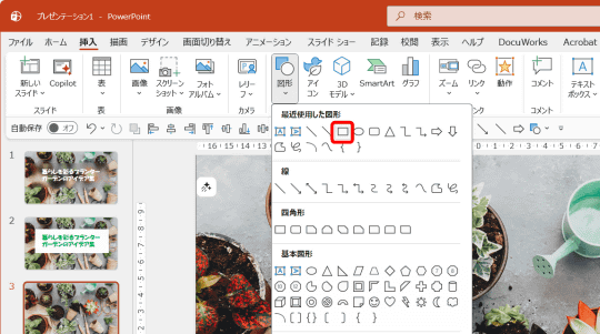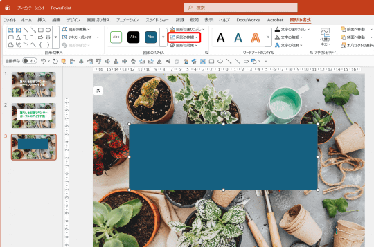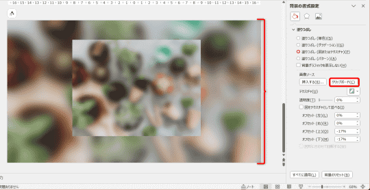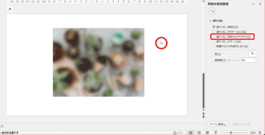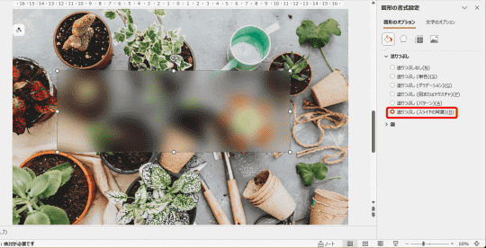 加工した画像がスライドの背景に設定できたので、元の画像をスライドいっぱいに拡大して準備完了です。図形の塗りつぶしとして、“スライドの背景”を設定するのがポイントです。