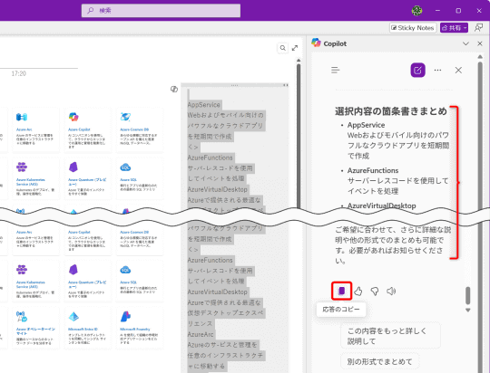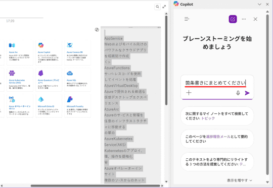 続けて、Copilotを呼び出して要約します。抽出したテキストを選択してプロンプトを入力するだけです。余計な改行や単純な誤認識は解消します。
