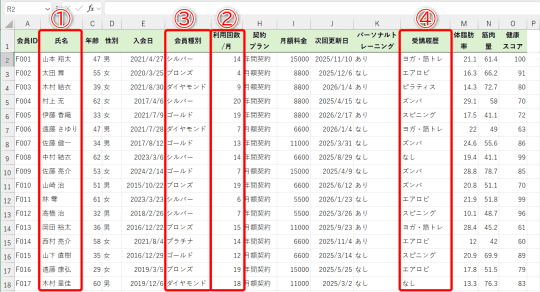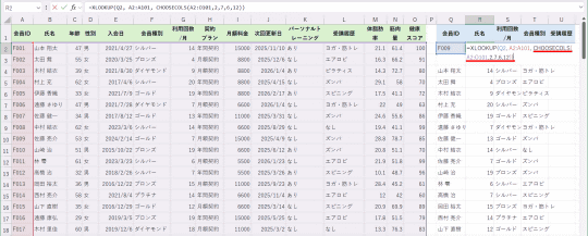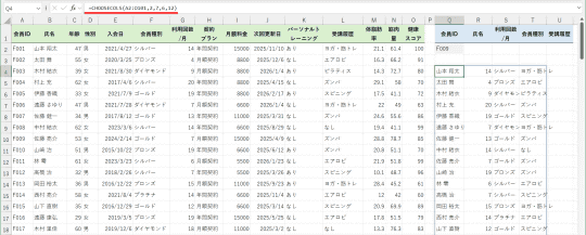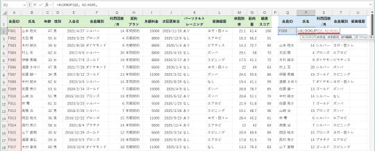 例えば、会員IDから、①「氏名」、②「利用回数/月」、③「会員種別」、④「受講履歴」を取り出す場合は、表全体(A2:O101)から、2、7、6、12列目を取り出すので、以下のように指定します。