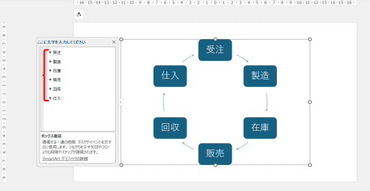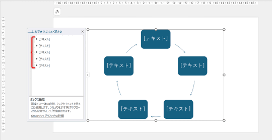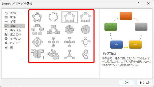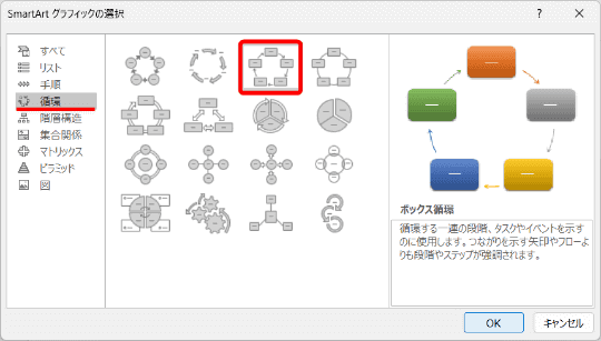 ここでは例として、SmartArtで循環図を挿入してみます。矢印や線、円など、作成したい図版で使えそうな必要な要素を含んでいるものを選択しておくと、後の作業が楽になります。