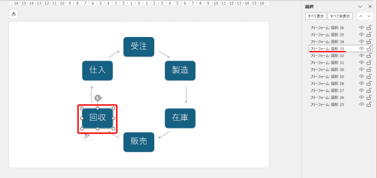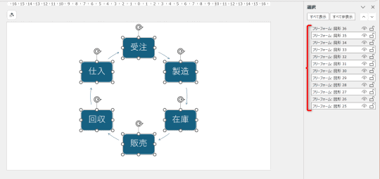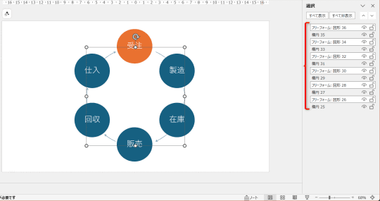ここでは、テキスト入りの図形の形を[楕円]に変更してみます。スライド上で[Ctrl]キーを押したまま、該当の図形を複数選択しても構いませんが、グループの解除後は図形が重なり合うことが多く、選択が難しくなります。[選択]のパネルから操作すると便利です。