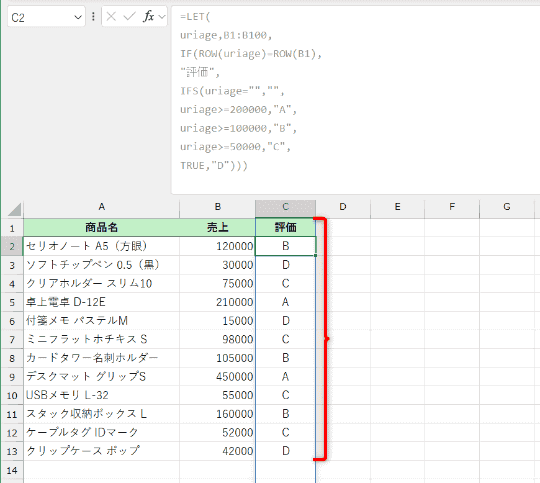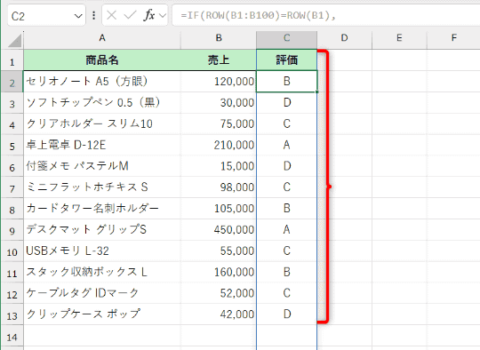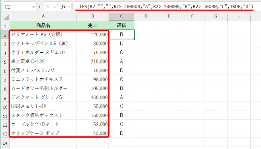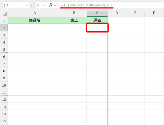 外側のIF関数の条件式「ROW(B1:B100)=ROW(B1)」で、セルB1~B100の行番号が「1」(セルB1)かどうかを、つまり見出し行かどうかを判定して、1行目なら「評価」と表示します。内側のIFS関数は、売上が入力されていなければ空白(B1:B100="","")を入力、その後に条件と評価を記述しています。最後の「TRUE」は「それ以外」を意味します。