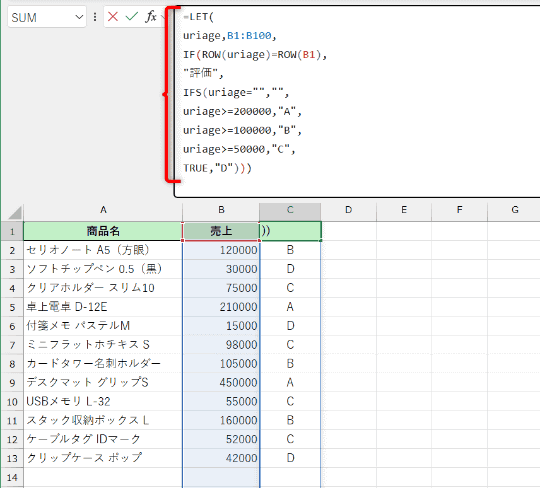 今回は、100行目までデータが入力されることを想定してセル参照します。ROW関数を使って、1行目が見出し行かどうかを判別して、2行目以降の売上を評価するIFS関数の数式を続けます。読みやすいように折り返していますが、続けて1行で記述して構いません。