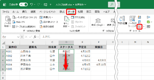 まずは、入力ミスを未然に防ぐ方法です。ステータスのように決まった値を入力する場合は「入力規則」を使ってドロップダウンリストを設定しましょう。