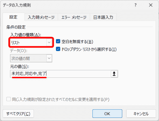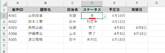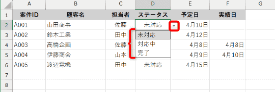 例えば「未対応」「対応中」「完了」の3つから選択できるようにしておけば、入力時に選択するだけで済み、表記ゆれを防ぐことができます。「未」「対応済」などのばらつきがなくなるため、後続の集計や分析も正確に行えるようになります。