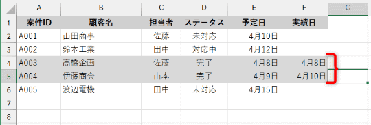 最後にもう一歩踏み込んで“異常を自動検出する”条件付き書式を設定します。ここでは、ステータスが「完了」なのに、実績日が入力されていないケースを検出してみましょう。条件式は次のように入力します。