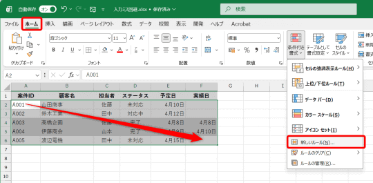 完了した案件はグレーアウトしておくといった運用はよくあります。手作業で行を塗りつぶさないで、「条件付き書式」を利用しましょう。自動的に状況をひと目で把握できるようになります。