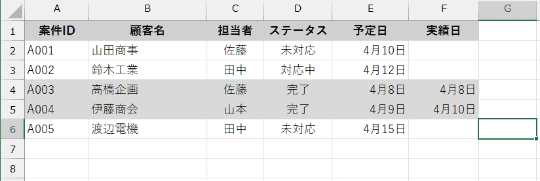 ここでは、「完了」の案件を灰色で塗りつぶしますが、同様の手順で、「未対応」は赤、「対応中」は黄色のように設定することも可能です。文字情報だけで判断するよりも、確認のスピードと正確性が大きく向上します。