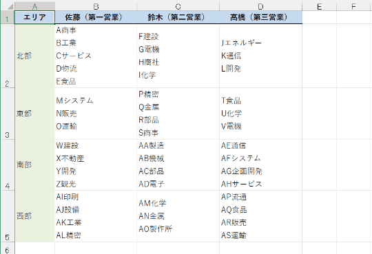 Excelで作成する表には、行と列の見出しを用意して、それぞれの交差する位置の値に着目する“クロス表”があります。例えば、以下のような営業案件の管理表を「チームとエリアごとにまとめて入力する」といった形式です。各セルには複数の企業名が改行されて入力されており、資料としては見やすく、直感的に状況を把握できます。