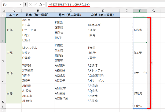 1つのセルに入力された複数のデータを分解するだけなら、以前に紹介したTEXTSPLIT関数が利用できます。改行コードを区切り文字として指定して、セル内のデータを横または縦に展開できます。例えば、セル内で改行されている企業名を縦に分解する場合は、次のように指定します。