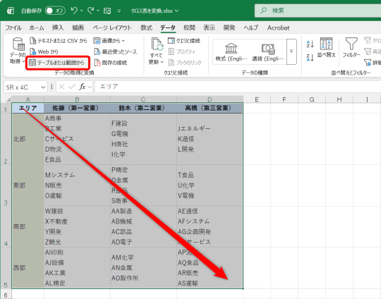 また、別の方法として、セルの内容をテキストエディターなどにコピーし、改行位置を整形してExcelに貼り付け直す処理もありますが、「複数の列」と「複数の行」にまたがるクロス表では困難です。エリアや担当者といった情報を維持しながら分解する必要があるため、単純なテキスト処理では対応しきれません。