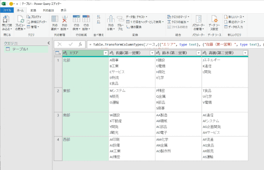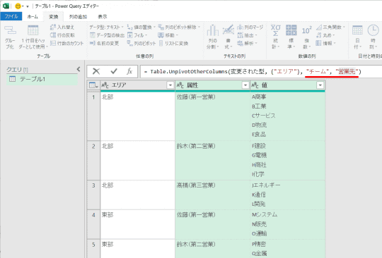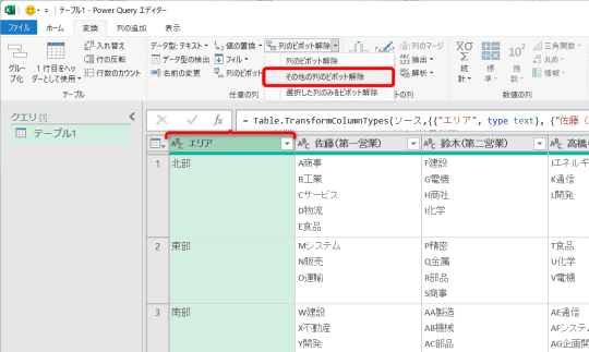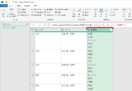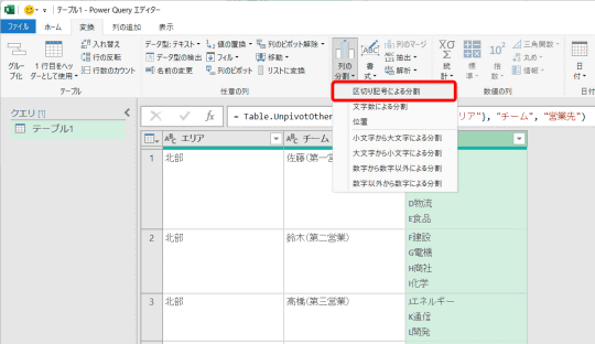 このようなケースでは、Power Queryを使ってデータを変換するのが有効です。表全体を対象にして「列の展開」や「行の分割」といった処理を一括で行えます。今回は、エリアを基準にして、チームと営業先のリストを行方向に分割します。