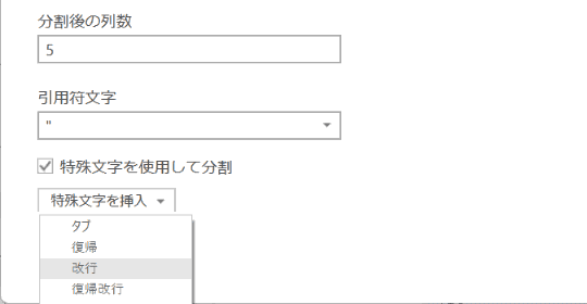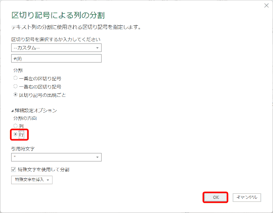 上記の手順で「#(lf)」と表示されていない場合は、[カスタム]を選択して、[特殊文字を使用して分割]にチェックを付けます。[特殊文字を挿入]の一覧から[改行]を選択します。「#(lf)」と表示されていることを確認してください。余計な空白が含まれていると正しく動作しないので注意してください。