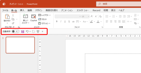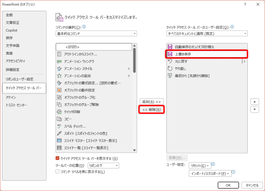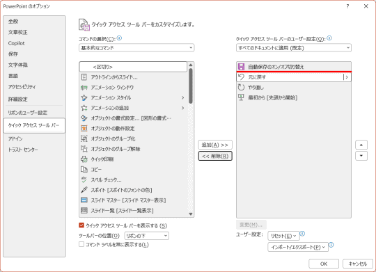 クイックアクセスツールバーには、標準で[自動保存のオン/オフ切り替え]と[上書き保存]、[元に戻す]/[やり直し]、スライドショーの[最初から]が用意されています。しかし、[Ctrl]+[S]キーを押せば[上書き保存]できますし、スライドショーも用途に応じて使い分ければ十分でしょう。不要な機能は削除しておくことをおすすめします。